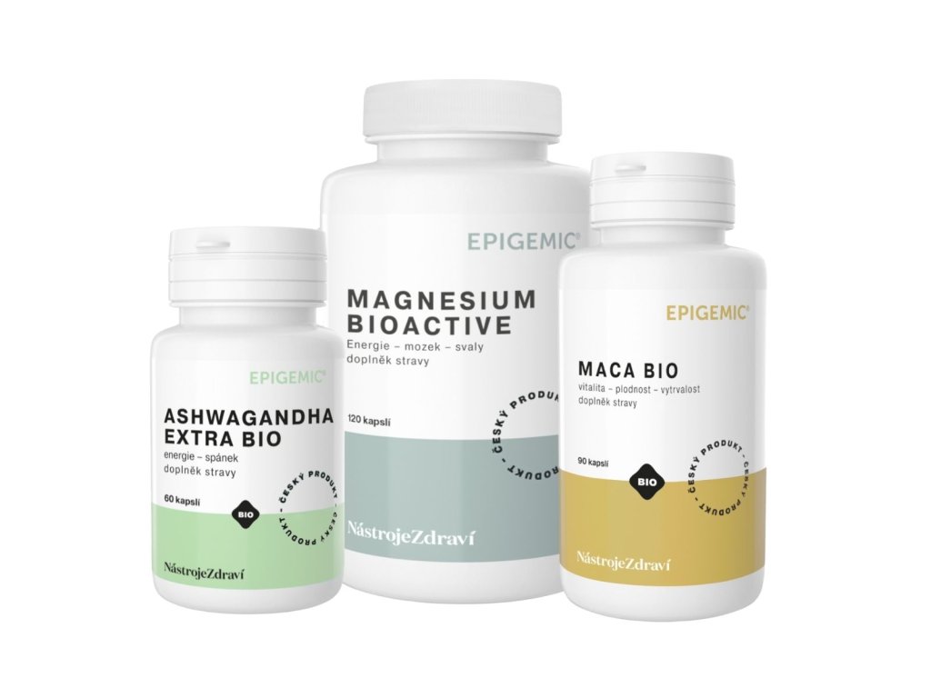 Ashwagandha EXTRA BIO pomáhá harmonizovat nervový systém, zlepšuje koncentraci, podporuje relaxaci a přispívá k lepšímu zvládání stresu i kvalitnímu spánku. Magnesium BioActive v bisglycinátové formě dodává tělu lehce využitelný hořčík, který pomáhá uvolnit svaly, snižuje únavu a podporuje správnou funkci nervového systému. Maca BIO zvyšuje vitalitu, vytrvalost a energii, příznivě působí na hormonální rovnováhu a podporuje sexualitu i plodnost. Společně vytvářejí účinnou kombinaci, která pomáhá zvládat moderní životní tempo, zmírnit stres a podpořit vyrovnanost během celého dne.