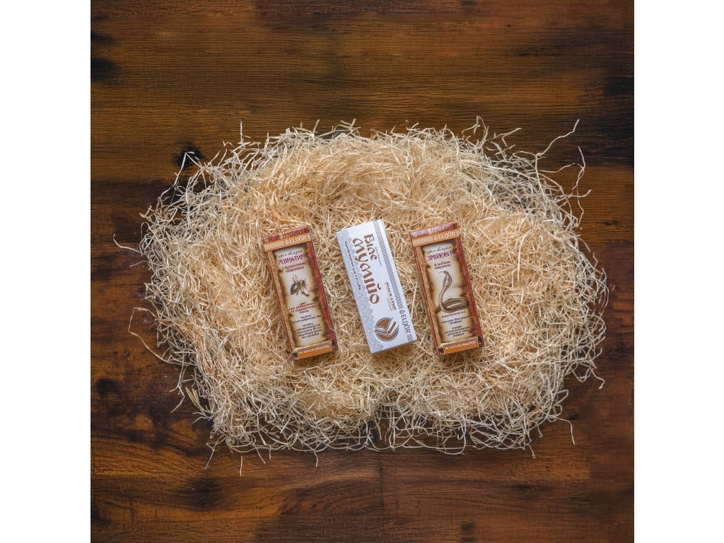 Tento kloubový set Elixir spojuje tři osvědčené krémy určené k úlevě od bolesti a podpoře pohybového aparátu. Zmijovít s hadím jedem a paprikou prohřívá, uvolňuje a pomáhá při akutní bolesti. Bílé Mumio intenzivně regeneruje klouby, šlachy a tkáně, díky čemuž je vhodné i pro dlouhodobou péči. Revmatim poskytuje úlevu při revmatických potížích, bolestech páteře a ztuhlosti — společně vytvářejí silný balíček pro každodenní podporu pohyblivosti.