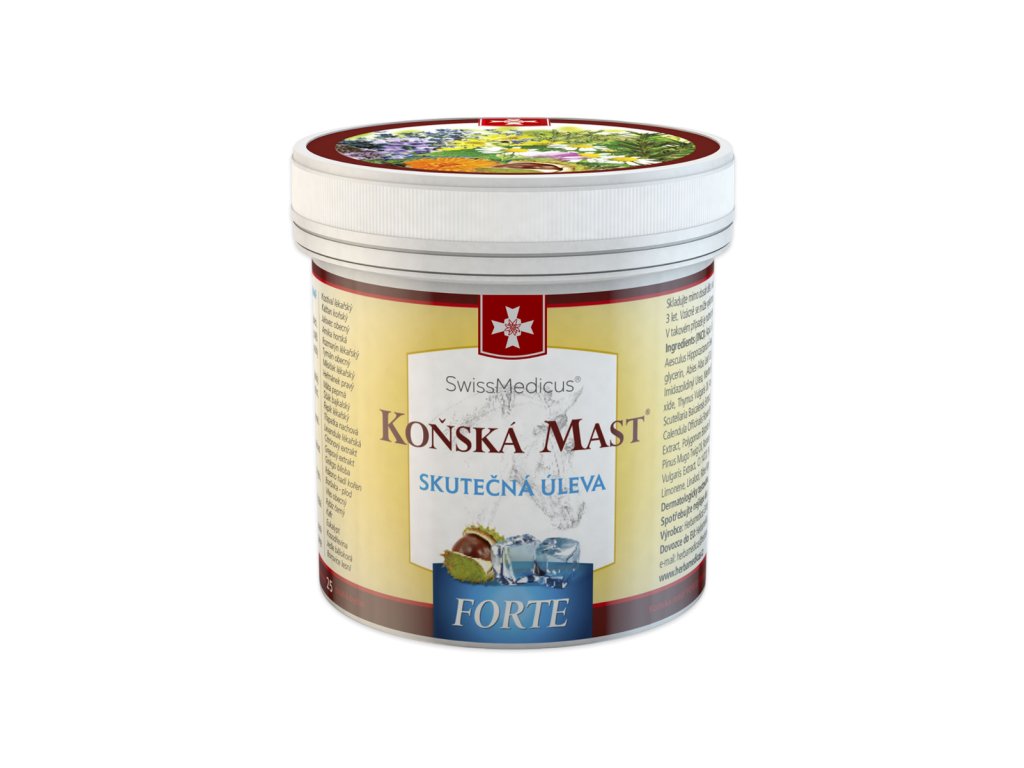 Koňská mast® forte chladivá je unikátní bylinný balzám vyrobený z 25 druhů bylin podle tradiční, generacemi prověřené receptury. Je vhodná k masáži pokožky při namožených zádech a kloubech a pro zmírnění svalové únavy po sportu či fyzické námaze. Účinná receptura obsahuje mimo jiné kaštan a kostival. Tato kompozice má chladivý efekt.